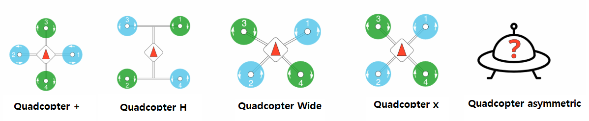 Quadcopter x는 위의 그림에서 보듯이 프로펠러가 X모양으로 장착되는 형태로 가장 대중적인 멀티콥터 형태이다.